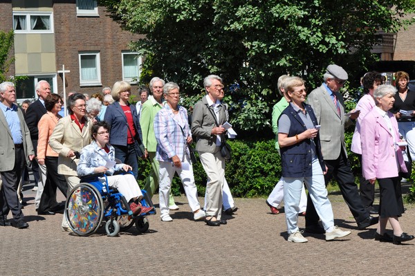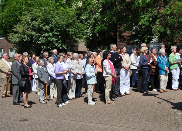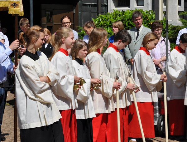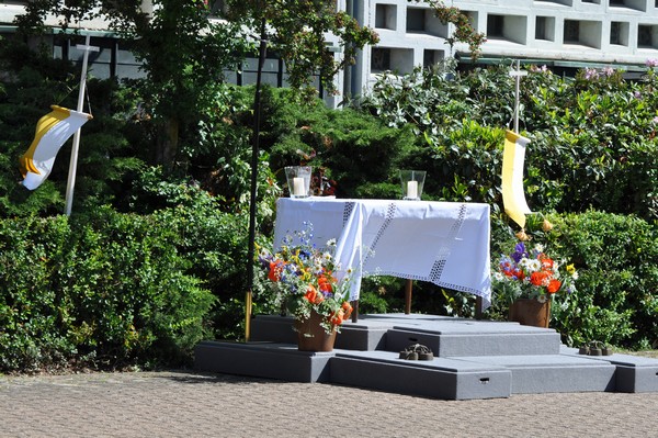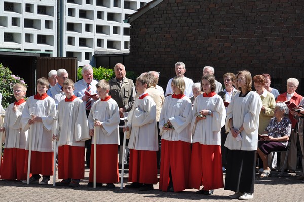 Jung und alt machten sich zu Fronleichnam auf den Weg zur „Demo“ des Glaubens, der Fronleichnamsprozession. Nach der Festmesse, in der Pfarrer Winterkamp wieder eine motivierende Predigt hielt, zog die Prozession weiter durch die Straßen zur Station am schön geschmückten Altar vor der Herz-Jesu Kirche. Hatten unterwegs noch zwei Blasgruppen den Gesang der zahlreichen Beteiligten unterstützt, wartete hier schon der Kirchenchor Herz-Jesu auf den Einsatz. Weiter ging es Richtung Heilig-Kreuz, vereinzelt hatten Anwohner ihre Straße mit Blumen geschmückt. „Ich fand am Schönsten das festliche Glockengeläut zum Empfang an jeder Kirche“, meinte eine Frau gerührt. Nach dem Abschlusssegen in der Heilig-Kreuz Kirche war dann auch der Appetit für die leckere Erbsensuppe da. Auch die Kleinen bekamen das versprochen Eis und konnten sich im Wäldchen austoben. Bei schönstem Sonnenschein gab es noch viel Gelegenheit zu Begegnung und Gespräch. Ein gelungener, gemeinsamer Tag.