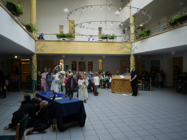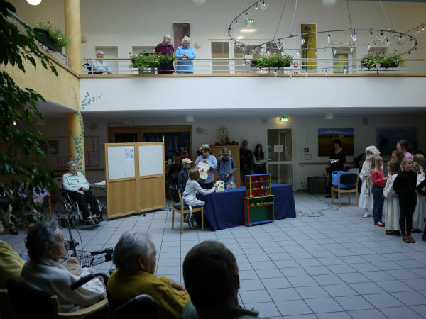 Viele Bewohner wie auch Eltern und Interessierte kamen, um nicht nur ein Schwein, sondern auch Würmer, einen Vogel mehrere Engel mit Petrus anzusehen. Geboten wurden ein Supermarkt mit Kassiererin, einer wichtigen Lautsprecherdurchsage, drei Kunden, die jeweils eine Wundertüte kauften, drei Helfer mit wichtigen Aufgaben und vieles mehr.