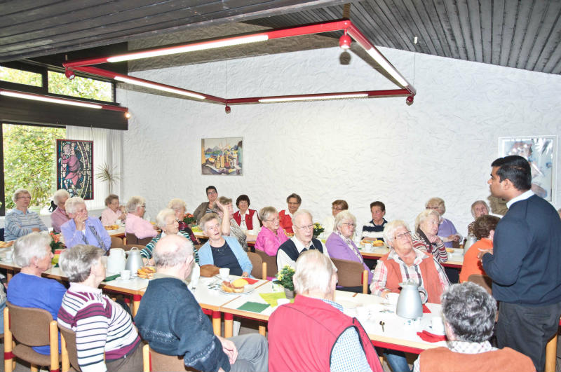 Der offene Treff der Senioren von Heilig Kreuz, "Wir über 70" hatte beim vergangenen Kaffetrinken im Kreuzbergheim einen besonderen Gast. Kaplan Benjamine war gekommen um aus seiner Heimat Indien zu erzählen. Sein Vortrag begann mit einem lustigen Vergleich von indischer und deutscher Mentalität in Gesellschaft, Wirtschaft und Straßenverkehr. Fröhliche und farbenprächtige Bilder erzählten von den Menschen und dem Leben in Indien. Neben der bunten und gut gestellten Gesellschaft wurden auch die krassen Gegensätze dazu in den Slums gezeigt. Die Wallfahrtsorte und die Kirchen, auch die Menschenmengen von Gläubigen haben alle sehr beeindruckt. Geduldig beantwortete Kaplan Benjamin in bestem Deutsch, die vielen Fragen und erklärte, dass er sich jetzt, nach zwei Jahren hier in Bocholt, doch schon sehr viel heimatlicher fühlt, als noch im vergangenen Jahr. Wir freuen uns alle sehr, dass er als Geistlicher hier bei uns lebt und arbeitet und unser Seelsorgeteam tatkräftig unterstütz. Wir bedanken und herzlich für seine Mühe und den tollen Einblick in sein Heimatland. Wir wünschen ihm einen erholsamen und glücklichen Heimaturlaub und eine gute Reise. für die Senioren "Wir über 70" Liesel Holtschlag