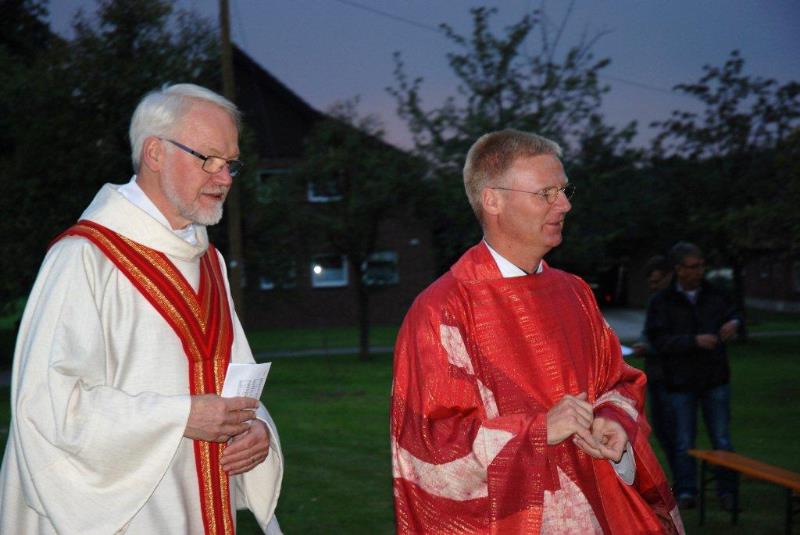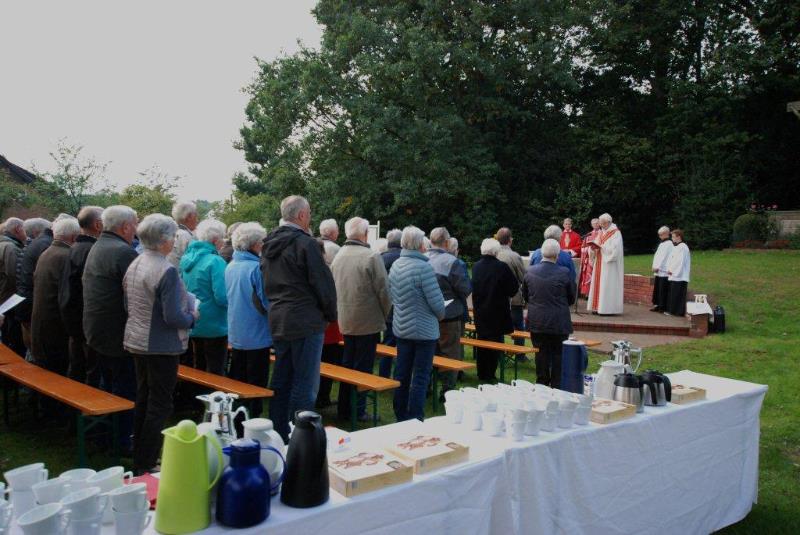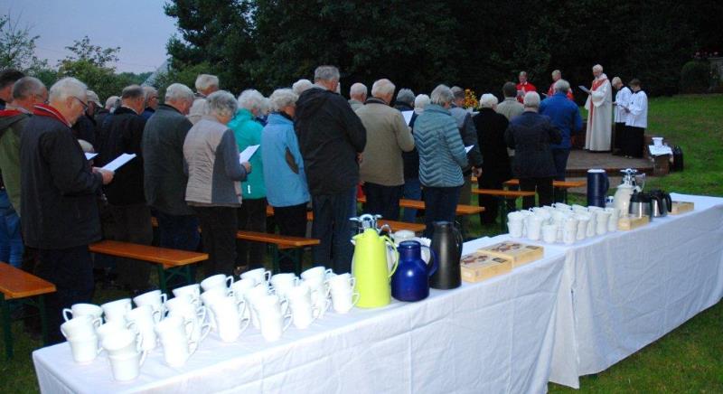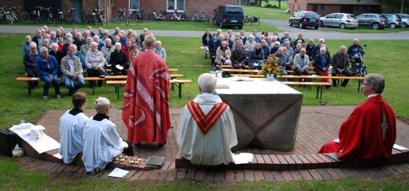 Es ist eine gute Tradition, dass die St.-Helena-Gemeinden aus Aalten, Barlo und Hemden nach dem Fest Kreuzerhöhung (14. September) gemeinsam eine hl. Messe am Hemdener Kreuz in Hemden feiern. In diesem Jahr war der Gottesdienst am vergangenen Mittwoch, 20. September. Passend zu dieser Open-Air-Veranstaltung brach nach einem regnerischen Vormittag am Nachmittag die Wolkendecke auf und die Sonne kam zum Vorschein. Im Anschluss an den stimmungsvollen Gottesdienst, bei dem Lieder und Texte zum Teil in deutsch und niederländisch gesungen bzw. vorgetragen wurden, hatten alle Besucher noch bei Tee, Kaffee und Gebäck die Möglichkeit zum netten Gespräch.