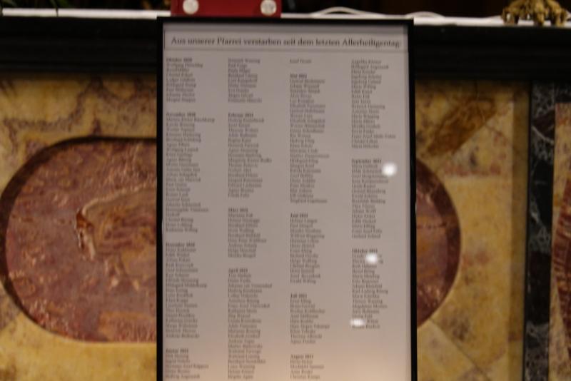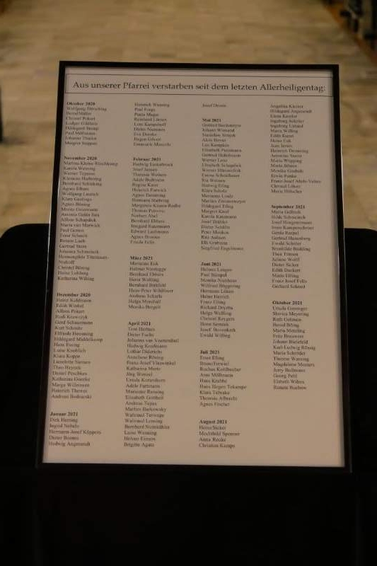 In verschiedenen Andachten und Eucharistiefeiern ist ihrer gedacht und sind ihre Namen verlesen worden. So am Nachmittag des Allerheiligentages in St. Helena, am Allerseelentag in der St. Agneskapelle am Schonenberg für die Verstorbenen der Kardinal-Diepenbrock-Stiftung sowie abends in den Messfeiern in Liebfrauen und Heilig Kreuz.