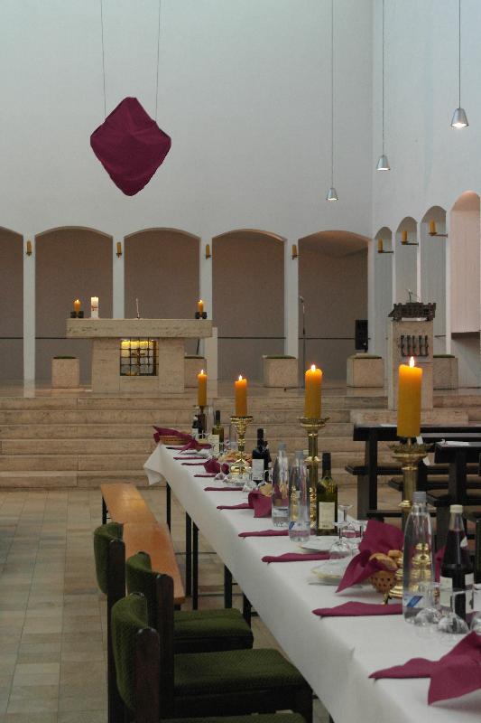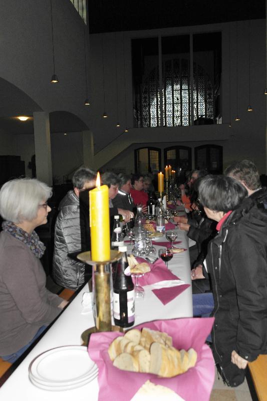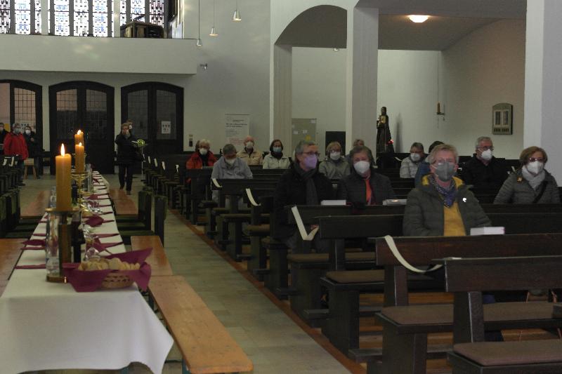 Am Dienstag fand der Gottesdienst der kfd zur Fastenzeit in der Heilig Kreuz Kirche statt. Pfarrer van Straelen feierte mit uns den Gottesdienst, den einige Frauen zum Thema Glauben vorbereitet hatten. Im Mittelgang stand eine lange Tafel an der wir nach dem Gottesdienst bei Brot, Käse, Getränken und guten Gesprächen einen schönen Abend in unserer Gemeinschaft verbrachten.