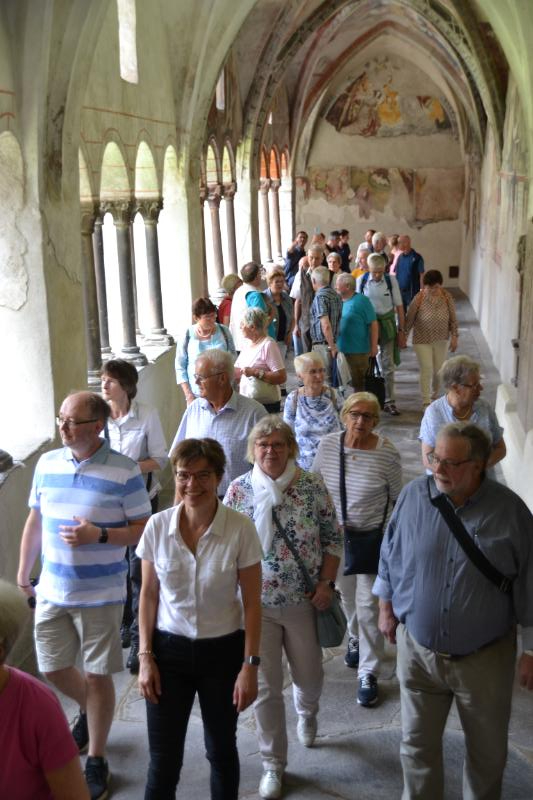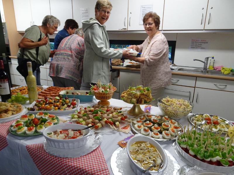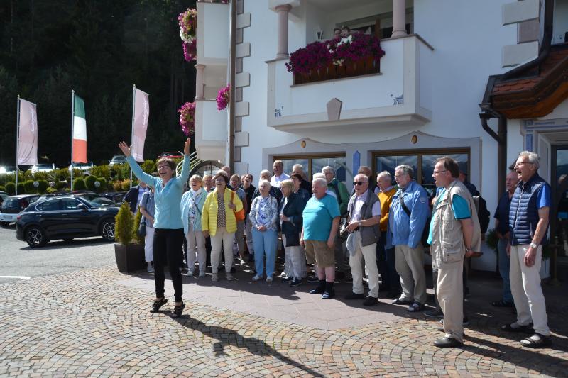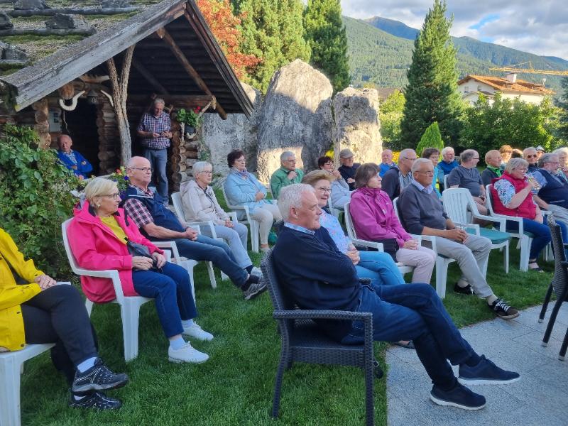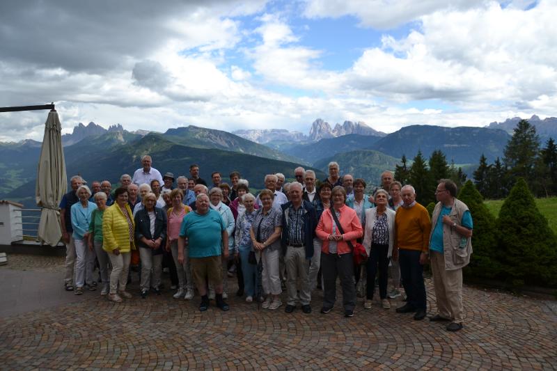 "Man hat direkt das Gefühl, als sei man wieder in Südtirol" So konnte man es am Freitag, den 22.09.2023 mehrfach vernehmen, denn so wunderbar war das Pfarrheim Herz-Jesu mit Girlanden in rot-weiß-grün, rotkarierten Tischdecken, Original Bildern mit Bergmotiven aus Südtirol und zwar in Poster Größe und mit Sonnenblumen passend zur Jahreszeit geschmückt. Die Wiedersehensfreude war bei allen deutlich zu spüren, und es waren nicht nur die Fahrtteilnehmer erschienen, auch zahlreiche Sängerinnen und Sänger, die aus beruflichen oder gesundheitlichen Gründen nicht mitfahren konnten, waren gekommen, um einen geselligen und besonderen Abend mit allen zu verbringen. Für das leibliche Wohl hatte dabei jeder der ca. 60 Gäste etwas mitgebracht und so war ein üppiges, vielfältiges und sehr köstliches Buffet zustande gekommen.Mit großer Spannung war die ca. 1-stündige Fotoshow erwartet worden. Direkt kamen Erinnerungen an die abwechslungs- und erlebnisreiche Fahrt vom 5. bis 11. August 2023 hoch, als noch mal die schönsten, bewegendsten oder lustigsten Fotos, Videos und Audioaufnahmen von der Fahrt gezeigt wurden. Zu den Highlights dieser Fahrt gehören auf jeden Fall die Besichtigung des alte Bischofssitz in Brixen mit dem Dom und Kreuzgang, die Fahrt in die Berge auf 1.500 m mit Panorama-Blick auf Seiser Alm mit Lang- und Plattkofel, die Landeshauptstadt Südtriols Bozen mit dem Obstmarkt, die Weinverkostung am Kalterer See, das schöne und ursprüngliche Arntal mit der Adlerhütte, das Krippenmuseum in Luttach, die Schifffahrt über dem Gardasee mit Besuch der malerischen Orte Limone und Malcesine und die berühmte Kurstadt Meran mit seiner Altstadt und den mittelalterlichen Laubengängen.