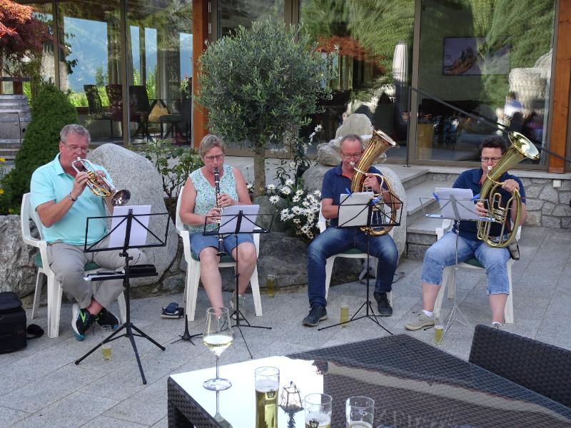 Bei der Fahrt gab es auch ein kleines Gartenkonzert, zu dem 4 Fahrtteilnehmer zur Überraschung aller mit Trompete, Klarinette und 2 Tenorhörnern aufgespielt hatten. Zu diesem Quartett gehören Petra und. Hans-Peter Wüpping, Christiane und. Dieter Kamps. Der Funke sprang auch an diesem Abend sofort wieder über und es wurde kräftig gesungen.