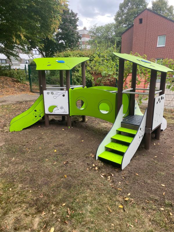 Gemeinsam im Team haben wir uns schon lange eine Veränderung auf dem U3 Außengelände gewünscht, da es für die Kinder bisher wenig Aufforderungscharakter hatte. Nach intensiver Suche haben wir uns im März auf ein passendes Spielgerät einigen können. Dann nahm der Prozess seinen Lauf: ein Außendienstler der beauftragten Firma hat im Mai vor Ort Maße genommen, eine Gartenfirma wurde zum Aufbau beauftragt und am 25.08.2025 wurde das Spielgerät endlich geliefert. Drei Tage später stand das Spielgerät einsatzbereit auf unserem kleinen Spielplatz.