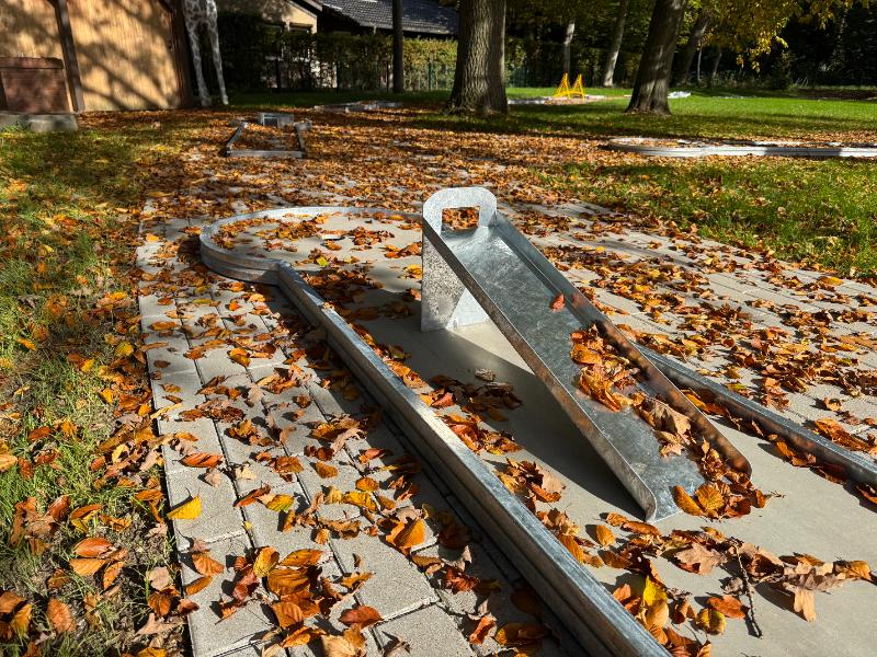 Im herbstlichen Sonnenlicht glänzen die neuen Bahnen der wiedererrichteten Minigolfanlage auf dem Spielplatz St. Helena in Barlo. Mit dem herbstlichen Laub, das den Weg sowie die Bahnen bedeckt, wirkt die neu angelegte Minigolfanlage als sei das Ende der Saison angebrochen, dabei ist die Anlage noch nicht in Betrieb genommen. In der vergangenen Woche jedoch wurde sie fertiggestellt.Mit der Erweiterung der Kindertagesstätte St. Helena um zwei Gruppen mussten einige Bahnen aufgegeben werden. Um die Baustelle mit Stellplatz für die Baufahrzeuge und Lagerplatz für Baumaterial einzurichten, musste die ganze Minigolfanlage abgebaut werden. Dies war vor drei Jahren (2022).
