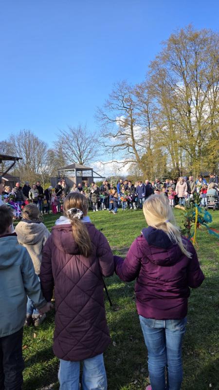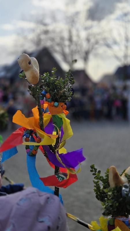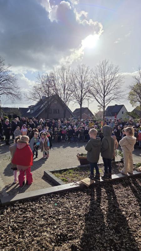Zu Palmsonntag feierten die Kinder unserer acht Kindertagesstätten einen Wortgottesdienst. Mit viel Begeisterung führten sie ein Rollenspiel zum Einzug Jesu in Jerusalem auf und machten die biblische Geschichte für alle erlebbar. Vom Schulhof bis zum Spielplatz zog die Gemeinde in einer großen Prozzesion und erinnerte dabei an den Weg Jesu.Auf dem Spielplatz wurden die liebevoll gestalteten Palmstöcke gesegnet. Anschließend konnte jeder einen gesegneten Palmzweig mitnehmen – für sich selbst oder für Menschen, denen es gerade nicht so gut geht, als Zeichen der Hoffnung und Verbundenheit. Der Wortgottesdienst war eine schöne gemeinsame Vorbereitung auf das bevorstehende Osterfest.