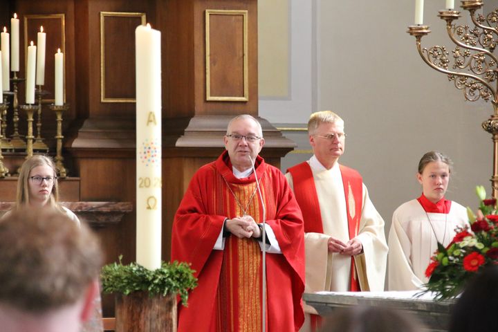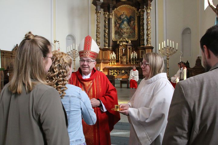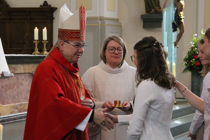 Am Samstag, 25.04.26, und Sonntag, 26.04.26, hat Weihbischof Dr. Christoph Hegge insgesamt 109 Jugendlichen die Firmung gespendet. Mit ihnen gemeinsam feierten ihre Patinnen und Paten, Familien, Freundinnen und Freunde in drei bewegenden Gottesdiensten in den Kirchen St. Georg, St. Josef und Liebfrauen.Die Spendung des Sakraments der Firmung war der Höhepunkt der Firmvorbereitung, in der sich die Jugendlichen darauf eingelassen haben, ihrem Glauben und der Frage, wo Gott und Glaube in ihrem Leben vorkommen, nachzugehen. Dazu gab es ein vielfältiges Angebot an Vorbereitungswegen, die für alle Jugendlichen der Stadt Bocholt gemeinsam angeboten wurden. Fünf Jugendliche, die Schüler der Bischof-Ketteler-Schule sind, wurden in der Schule vorbereitet, und empfingen am Samstag ebenfalls die Firmung.